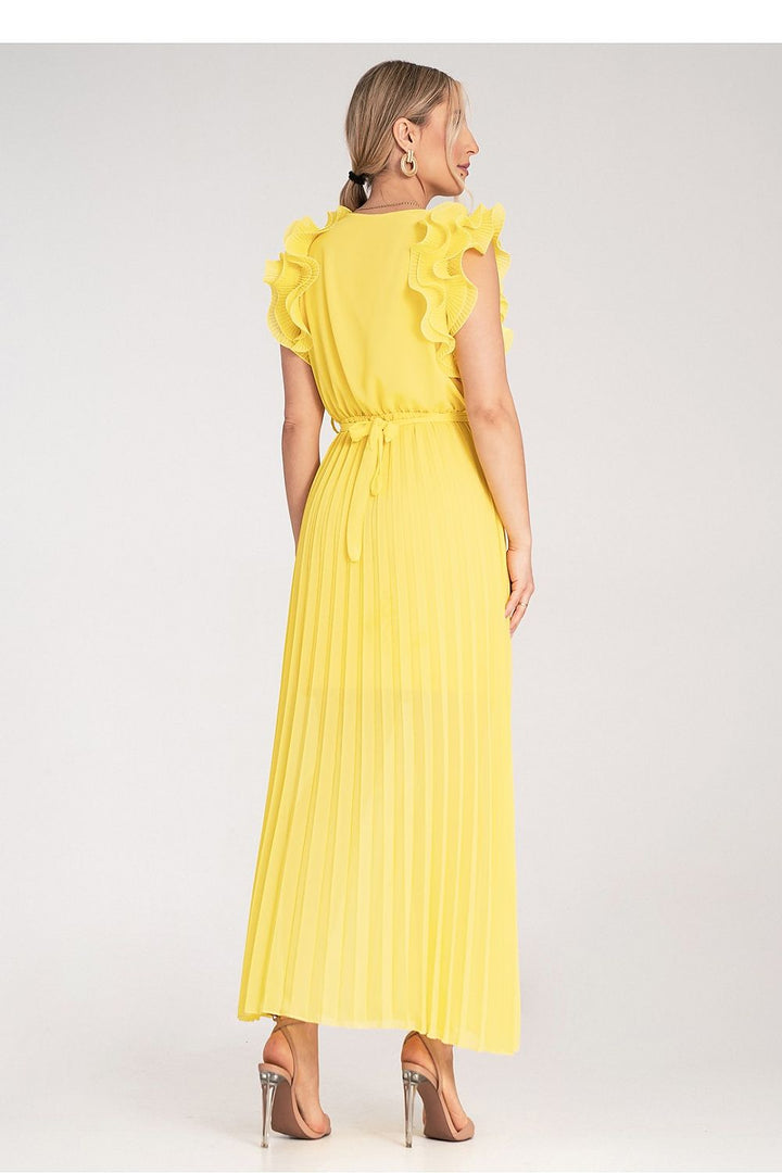 Maksi haljina s omotanim dekolteom i ukrasnim, dvostrukim volanima na ramenima. Elastična traka i platneni remen za vezanje u struku. Donji dio je dug, s malim naborima, izrađen od lagane, poluprozirne tkanine.