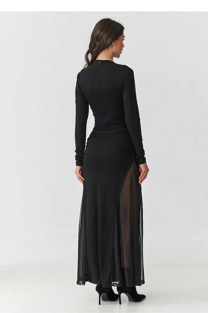 Elegantes Maxikleid in klassischem Schwarz, perfekt für besondere Anlässe. Der taillierte Schnitt betont die weibliche Silhouette, während transparente Tüll-Einsätze an den Seiten Leichtigkeit und Sinnlichkeit verleihen. Hoher Ausschnitt und lange Tüllärmel sorgen für zeitlose Eleganz. Diskreter Rückenreißverschluss für einfache Handhabung und perfekte Passform. Schlankt die Figur und kombiniert Stil mit Komfort.