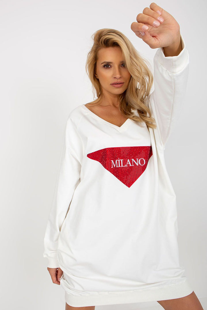 A long women's casual sweatshirt is a combination of comfort and stylish design. It features a dominant print on the front, adorned with trendy jet stones, which give it a unique character and subtle shine. The sweatshirt is made of high-quality blend of cotton, polyester, and elastane, ensuring comfort, durability, and a delicate fit to the silhouette. The extended length model with a V-neckline provides freedom of movement and a stylish look. The long sleeves make the sweatshirt perfect for cooler days, and practical pockets hidden in the side seams add functionality. The lack of fastening emphasizes its casual character, making it a perfect choice for everyday wear, with jeans, leggings, or more elegant trousers.